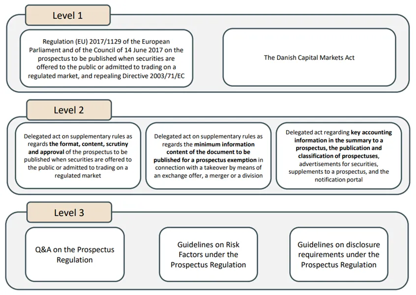 Moreover, level 2 acts in the form of delegated regulations and regulatory technical standards further lay down specific requirements to e.g. the contents of prospectuses. Furthermore, ESMA has at level 3 prepared Q&A’s and guidelines the purpose of which is to contribute to the understanding of the regulatory framework at both level 1 and 2. The level 3 documents are updated and published by ESMA on a current basis. The list of all legislation is available on the website of the Danish FSA (FSA) and is currently updated as ESMA prepares additional material.